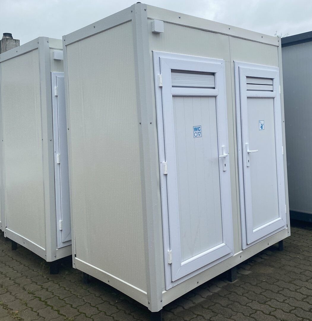 Notre bloc sanitaire SS1 est une unité sanitaire mobile avec deux portes, chacune menant à une cabine WC équipée d'un lavabo et d'un lave-mains, avec des lucarnes partiellement ouvrables.